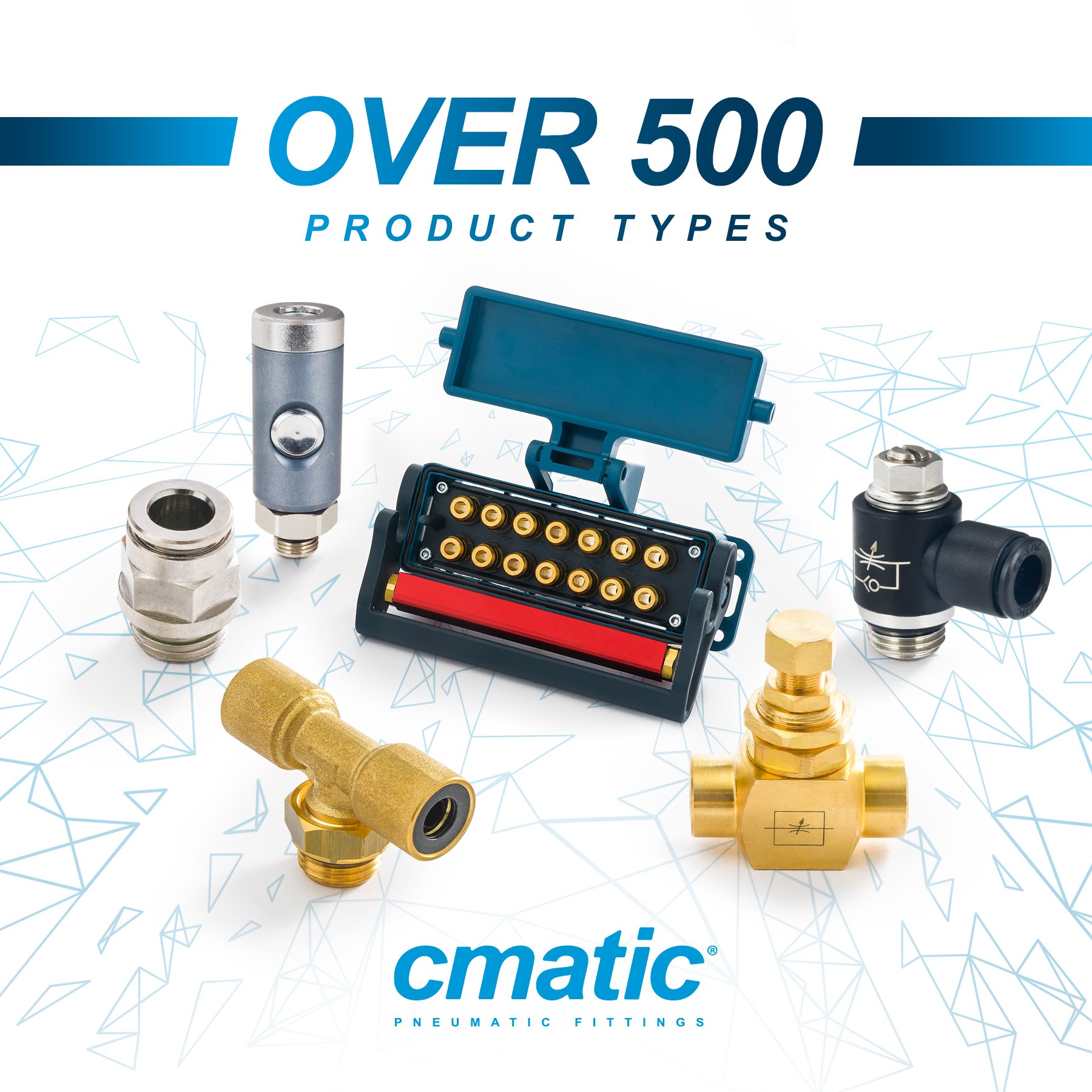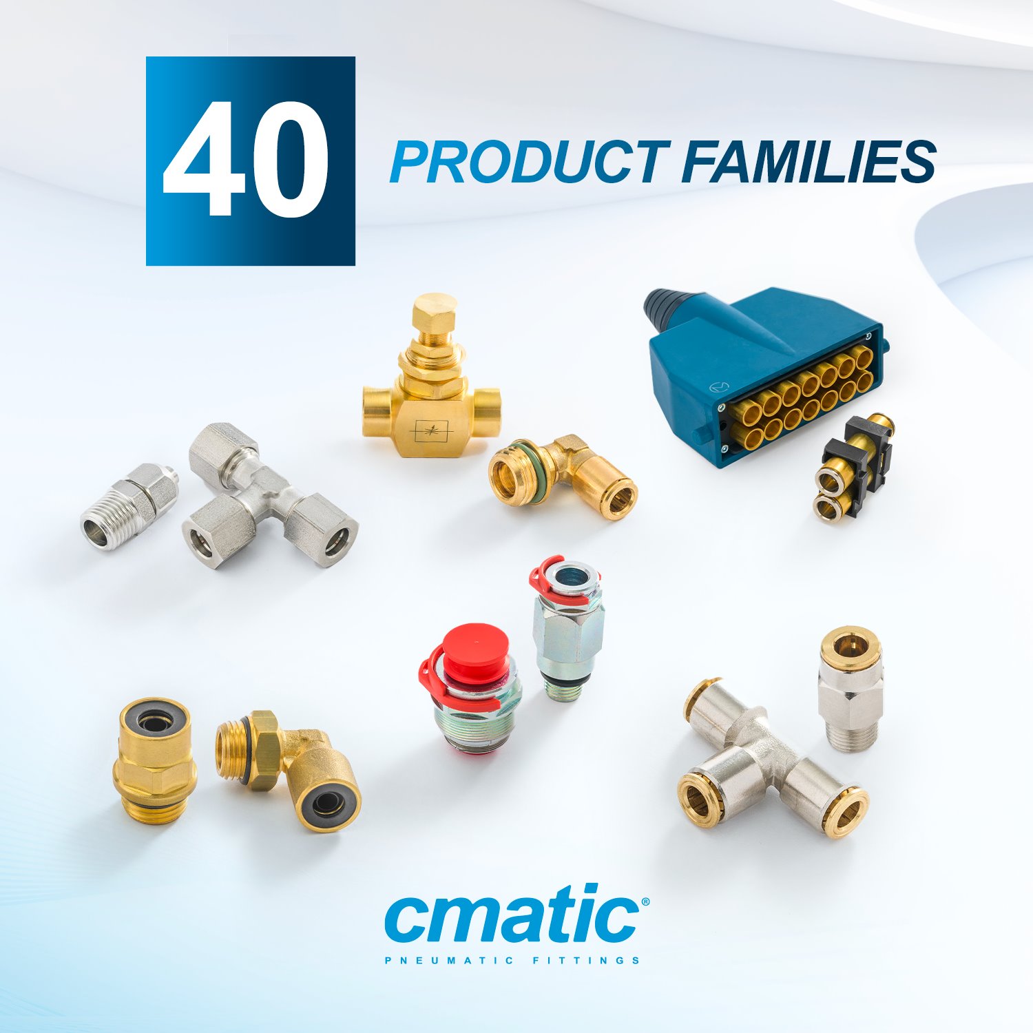Today Cmatic can boast a very wide range of fittings covering every possible requirement. Our sales program offers more than 41 series and 4000 variants in types and sizes. Cmatic’s core business spans through Push-in, Push-on, Compression, Standard and Function Fittings, Couplings, Safety Couplings, and Multiple Connectors. Cmatic products can be employed in all industries related to General Pneumatics including solutions for Pneumatic Automation (Food, Chemical, Pharma, Vending Machine and Dirty and Critical Applications), Lubrication, Misting, Transportation, and Hydraulics.